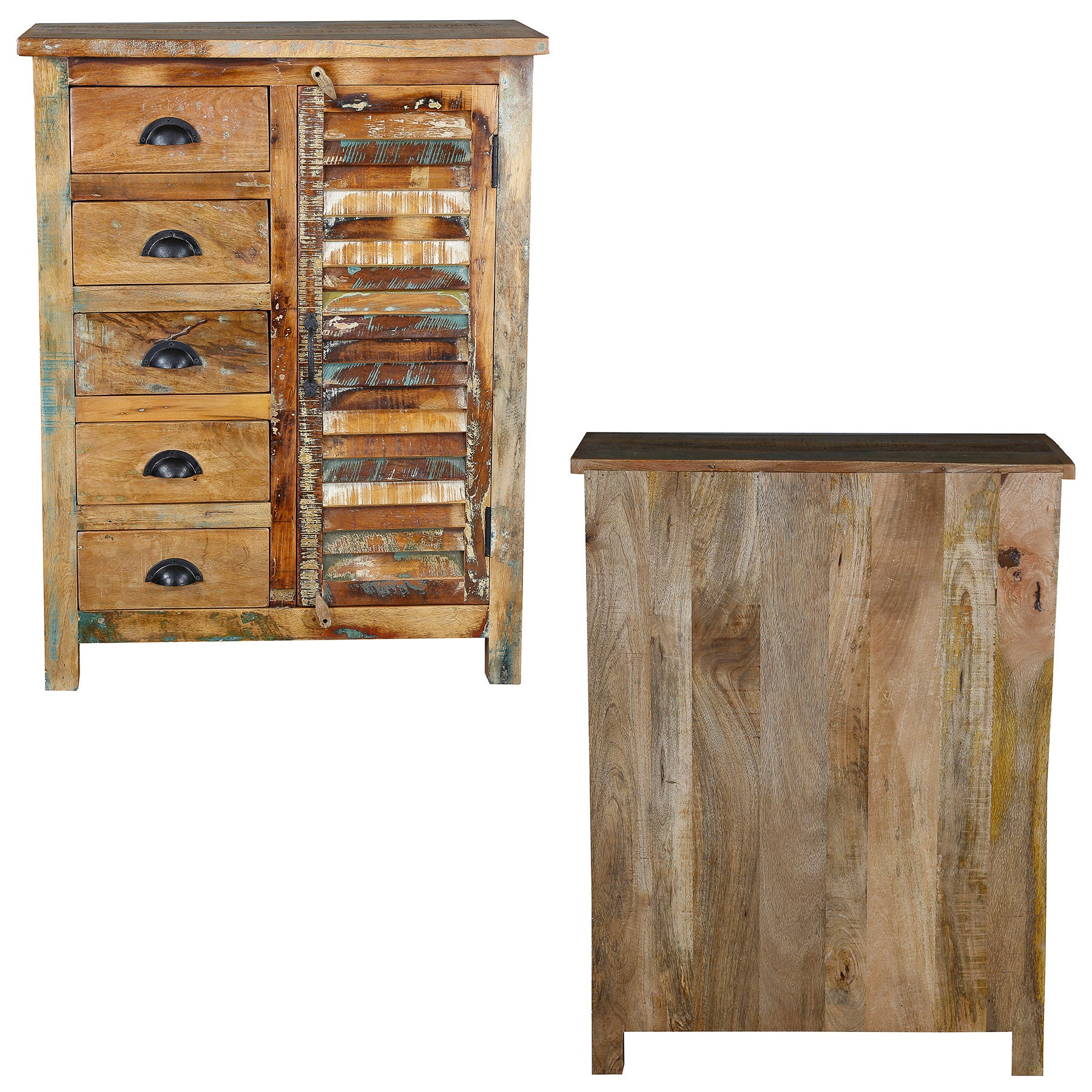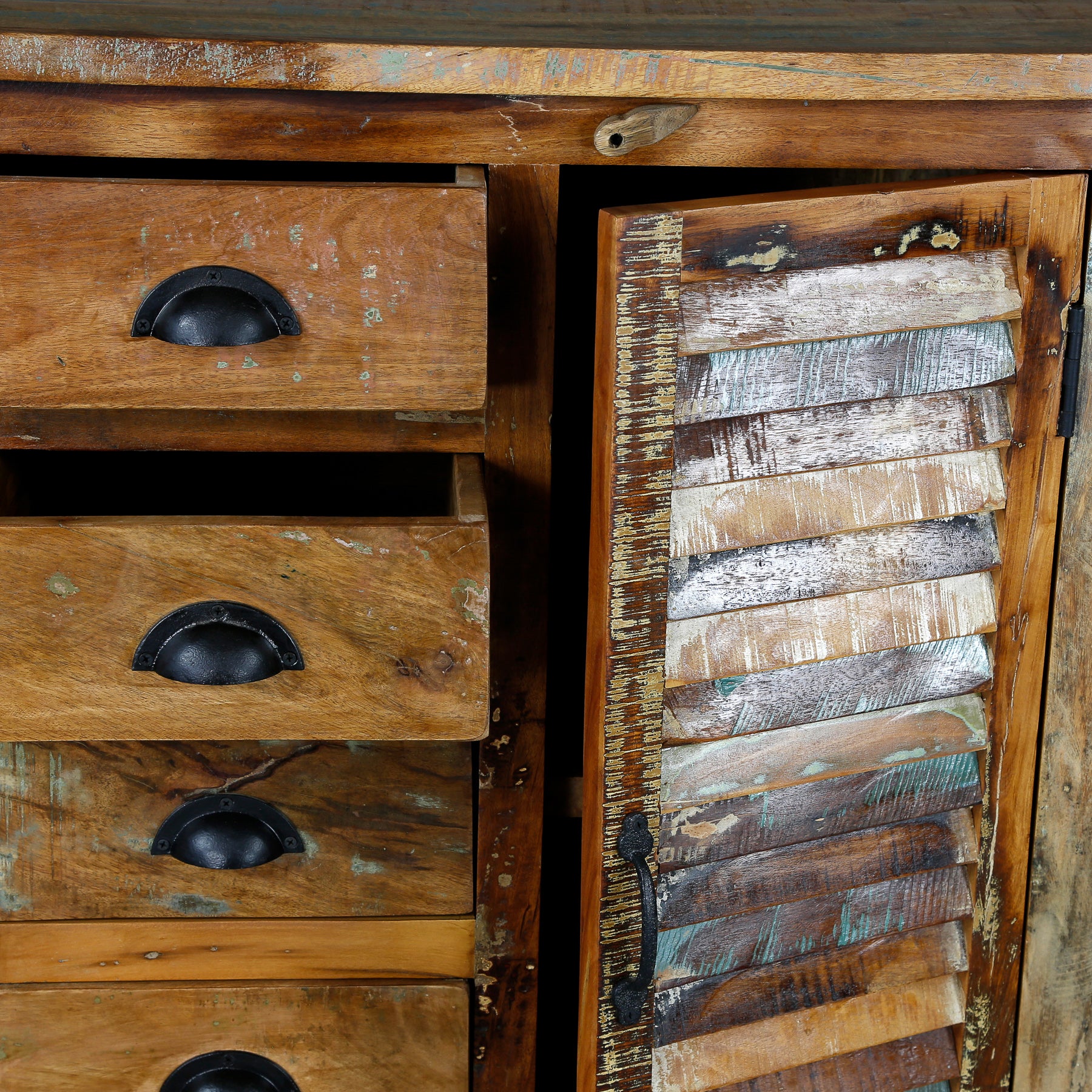 Front- und Seitenansicht eines Highboards aus Altholz mit Schubladen und Tür, freigestellt