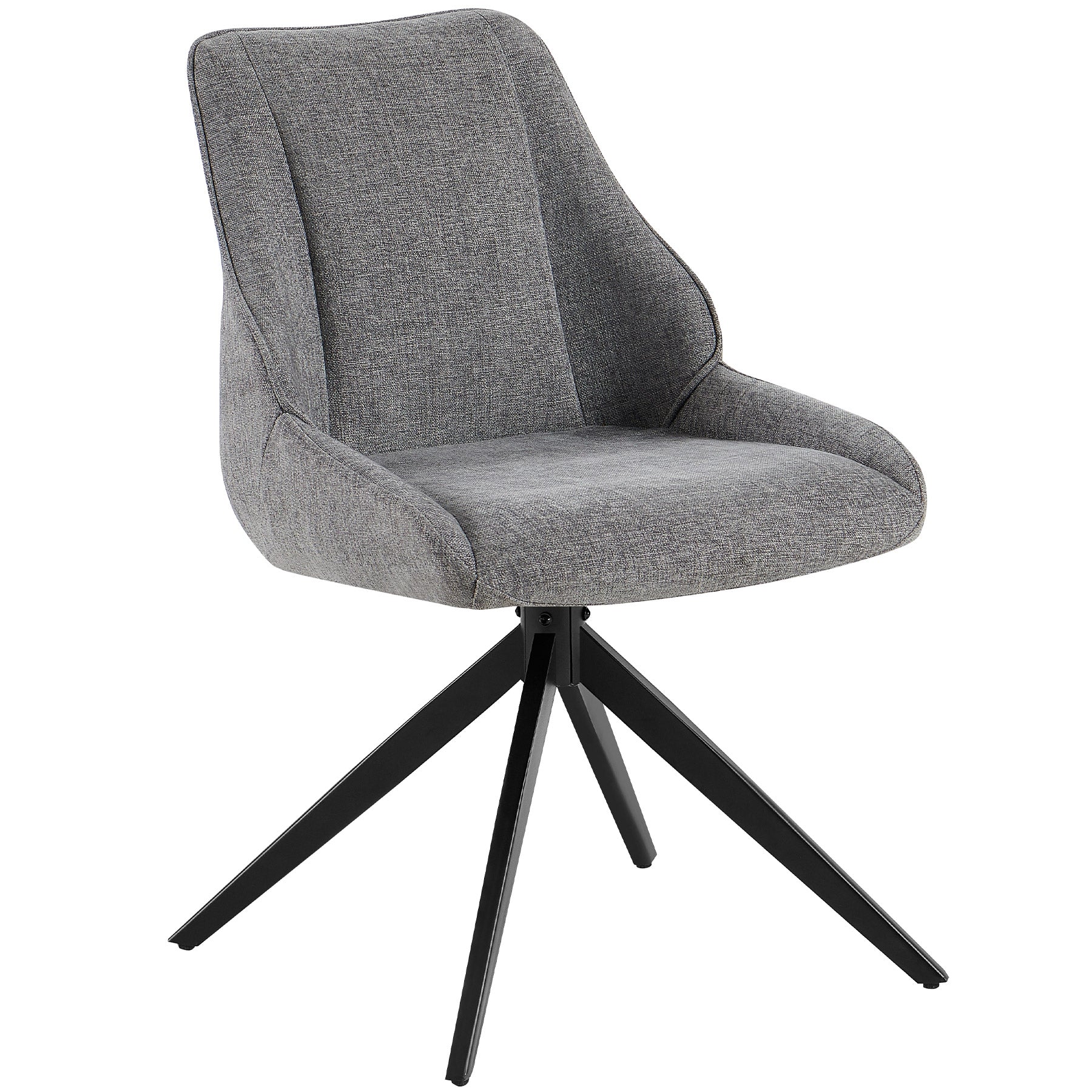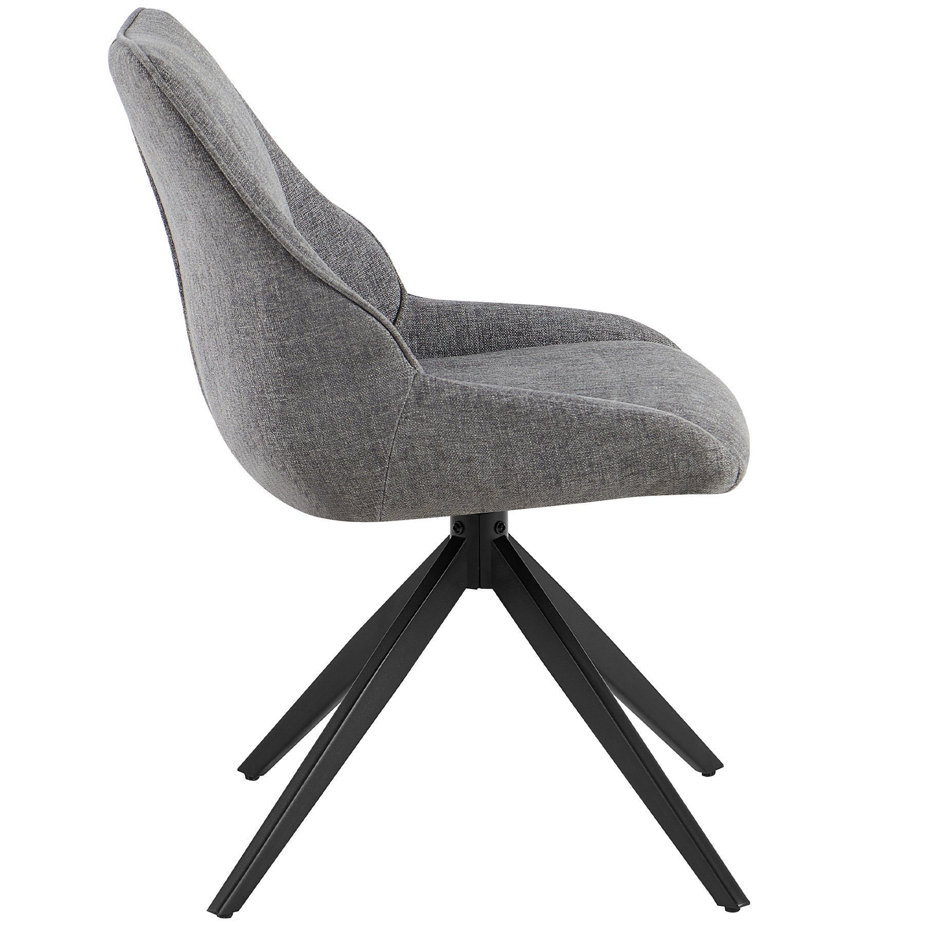 Seitenansicht eines 360° drehbaren Esszimmerstuhls in Grau mit gepolsterter Sitzfläche und Rückenlehne auf schwarzem Metallgestell in Stativform