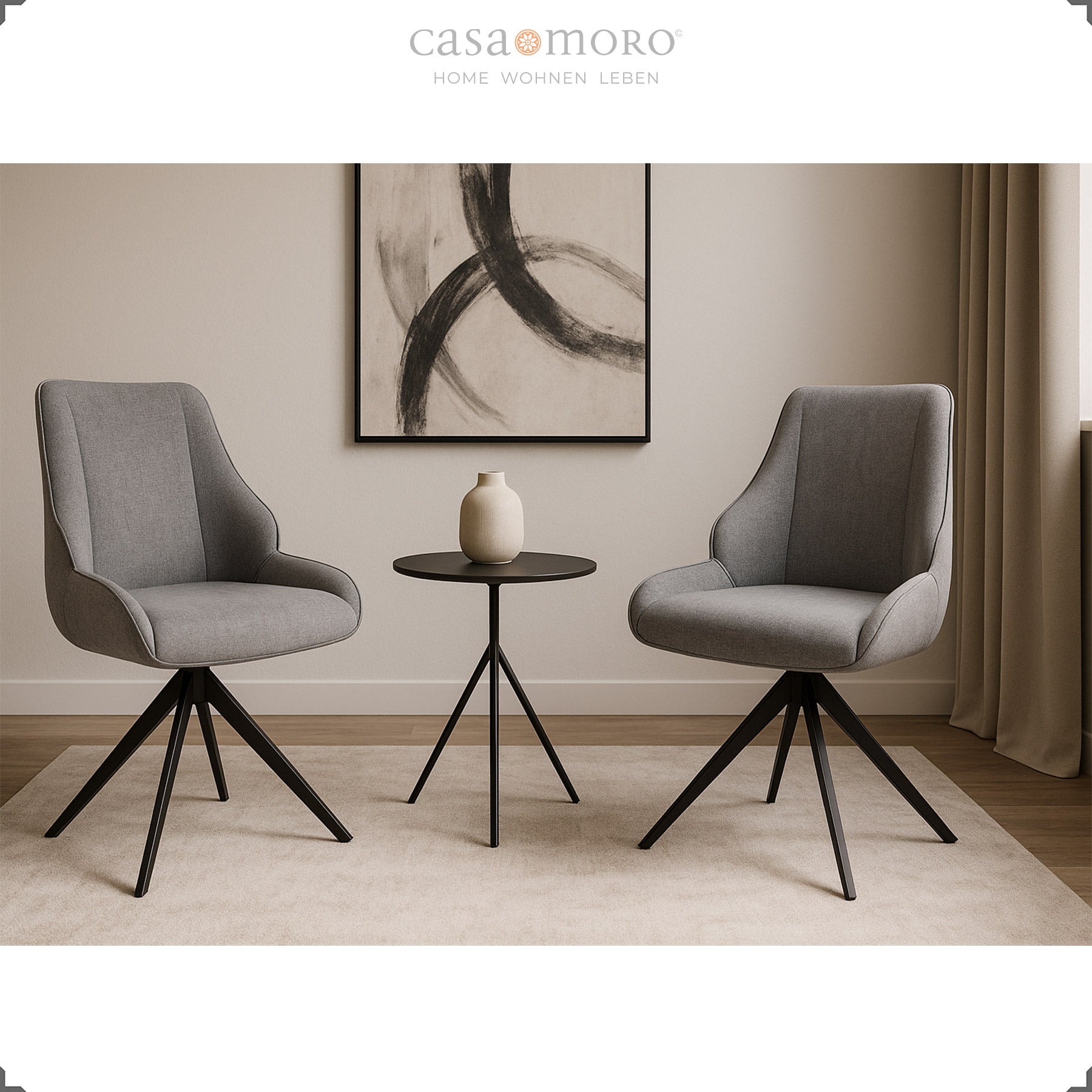 Zwei 360° drehbare Esszimmerstühle in Grau mit schwarzem Metallgestell neben rundem Beistelltisch in modernem, hell eingerichteten Wohnraum