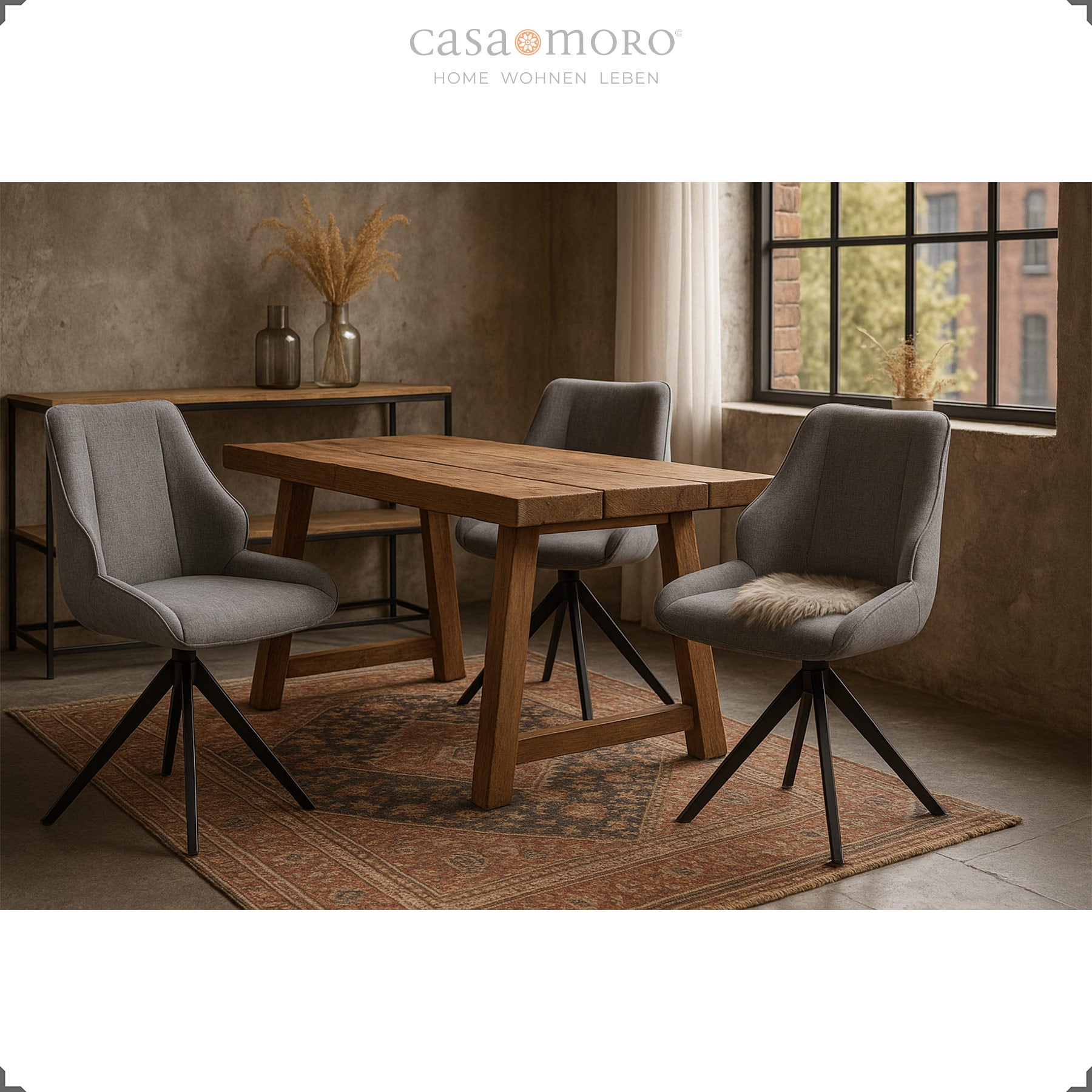 Drei 360° drehbare Esszimmerstühle in Grau mit schwarzem Metallgestell um einen Holztisch in modernem Loftambiente mit Teppich und Dekoration