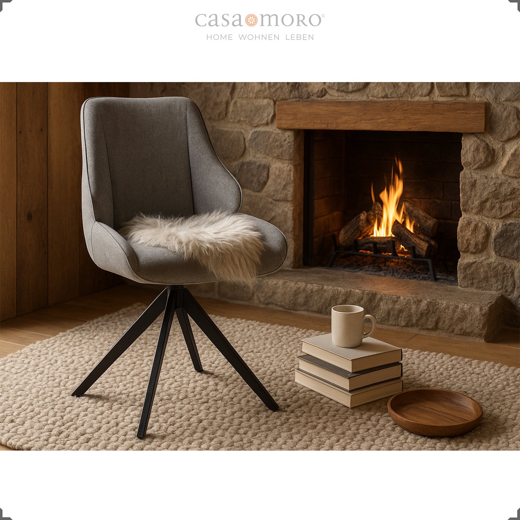360° drehbarer Esszimmerstuhl in Grau vor Kamin mit Fellauflage, Bücherstapel und Tasse – gemütliche Wohnszene mit warmem Licht