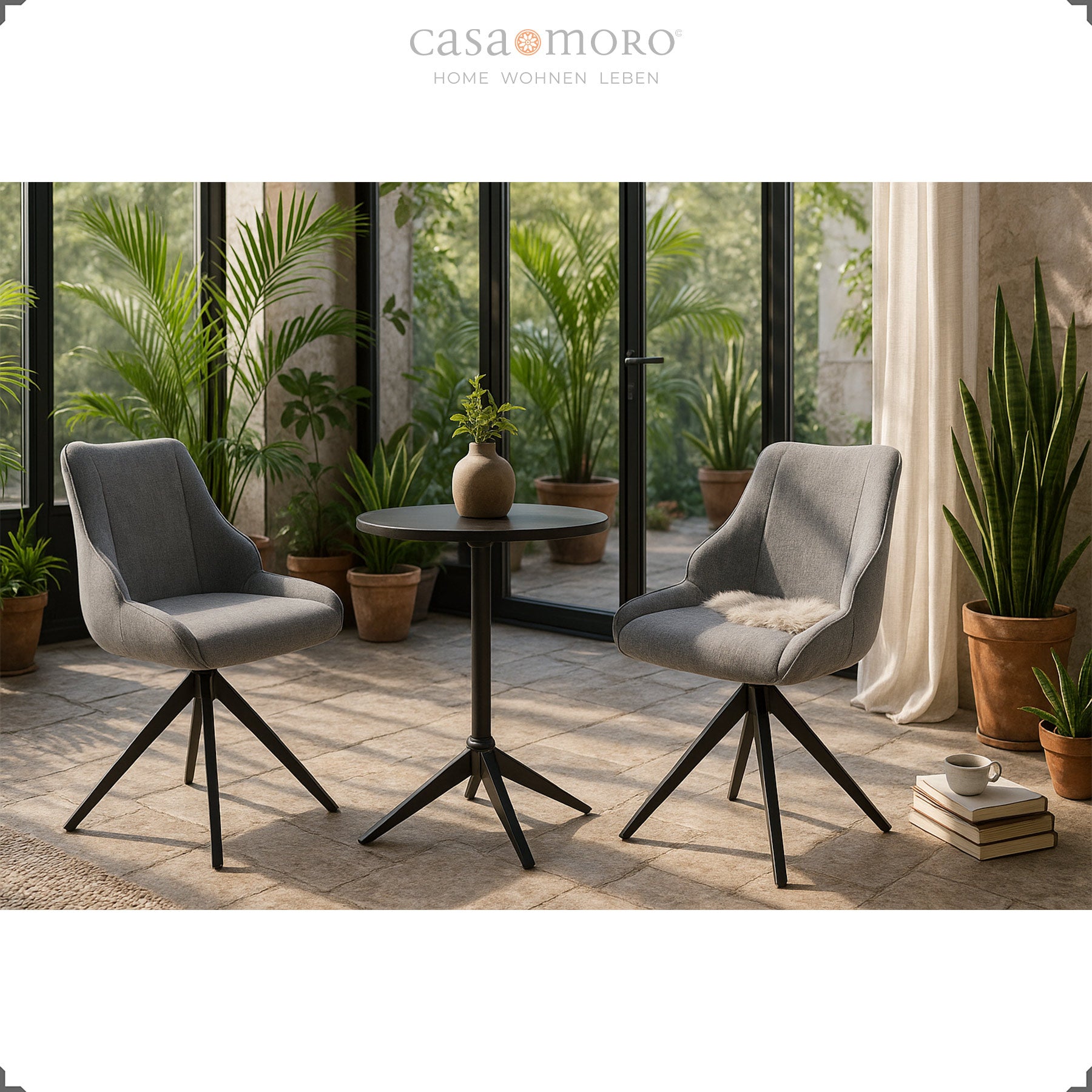 Zwei 360° drehbare Esszimmerstühle in Grau mit schwarzem Metallgestell, arrangiert im Wintergarten mit Pflanzen und natürlichem Licht