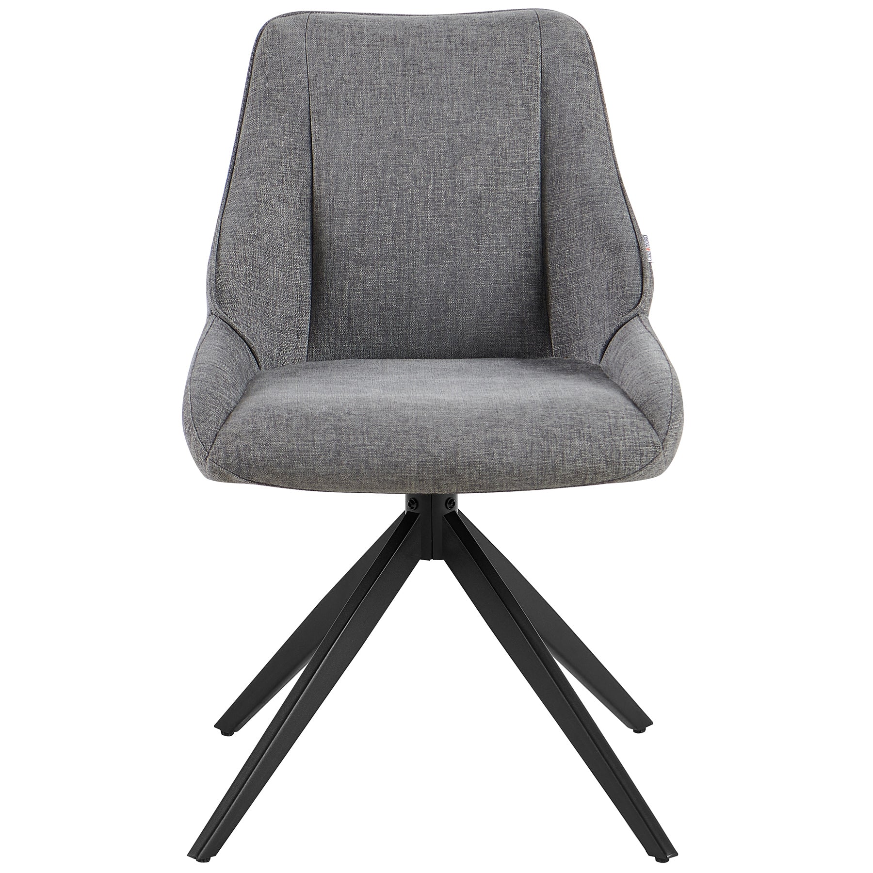 Vorderansicht eines 360° drehbaren Esszimmerstuhls in Grau mit gepolsterter Sitzfläche, ergonomischer Rückenlehne und schwarzem Metallgestell