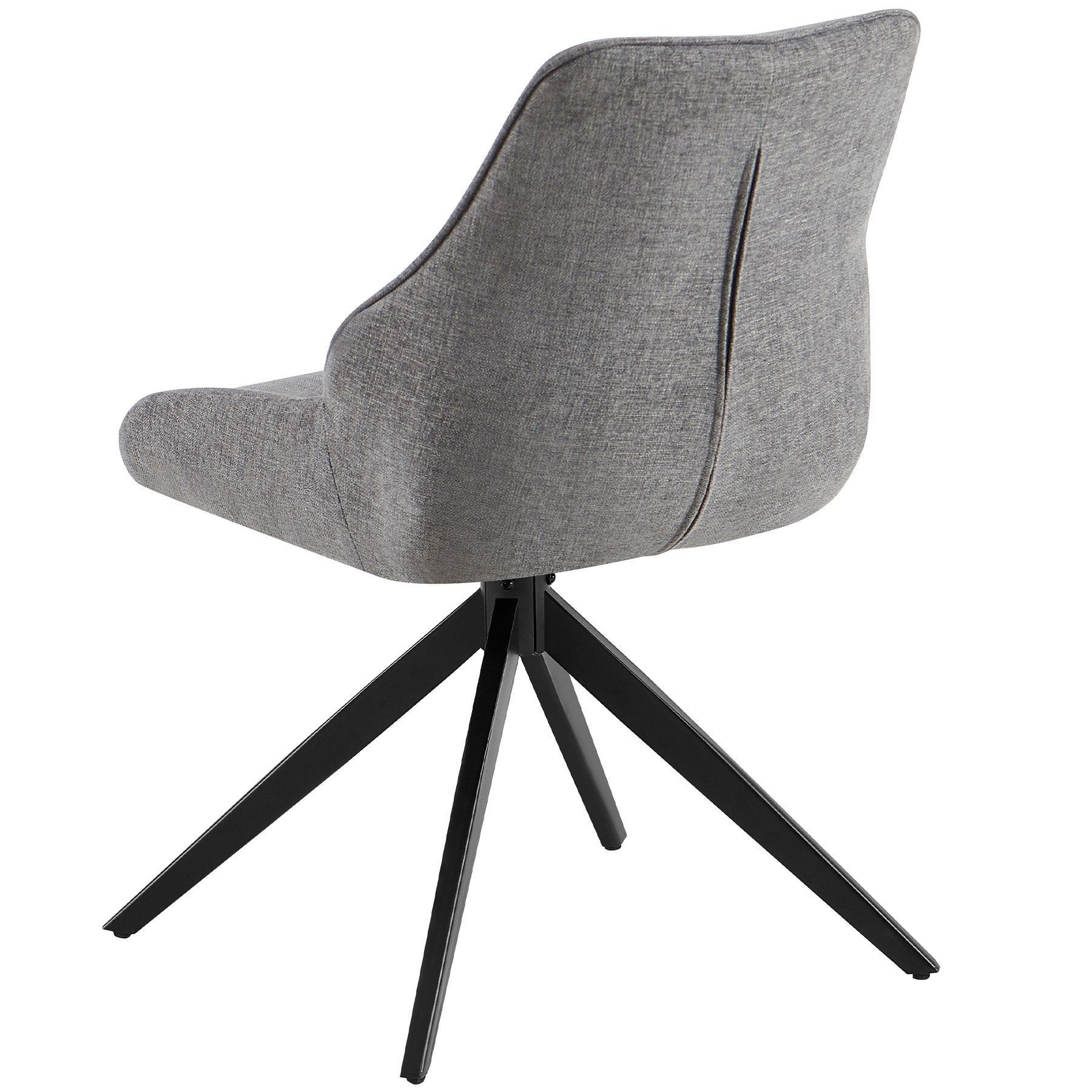 Rückansicht eines 360° drehbaren Esszimmerstuhls in Grau mit gepolsterter Rückenlehne und schwarzem Metallgestell in moderner Stativform
