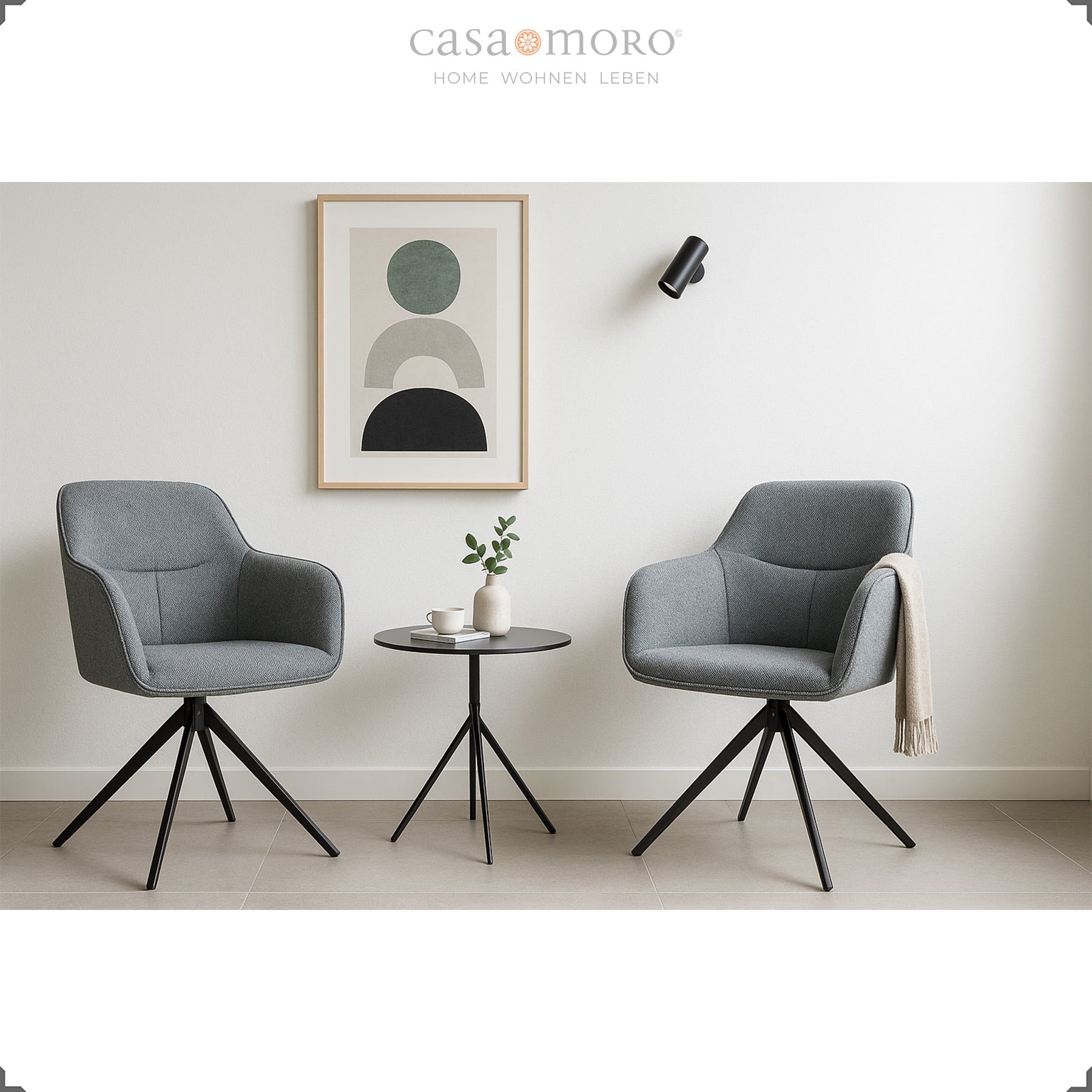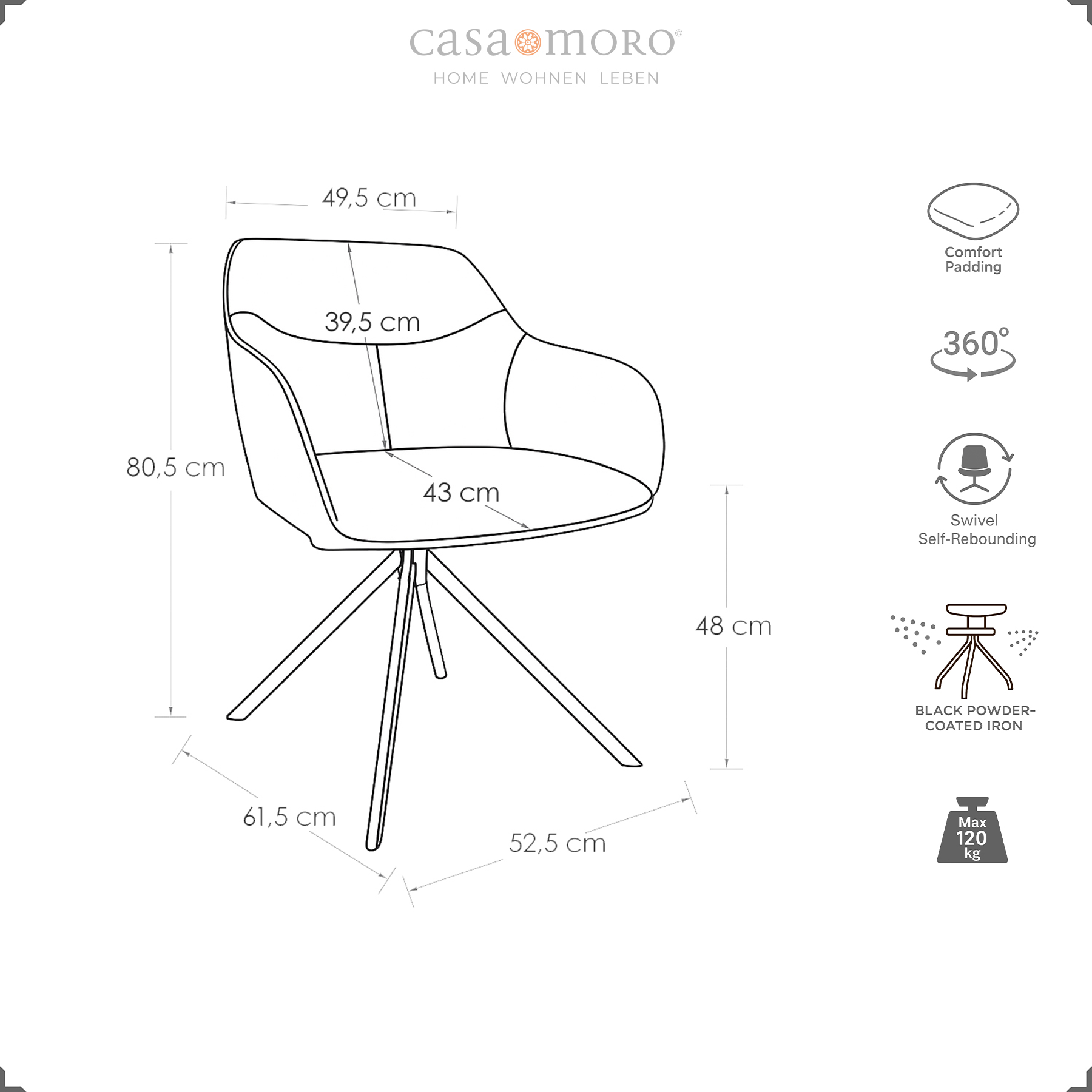 Als 360° drehbar ausgeführter Polsterstuhl mit Armlehnen begleitet er Dich vom schnellen Frühstück bis zum späten Gespräch – komfortabel, funktional und stilvoll. Ein Drehstuhl mit Metallgestell und Rückenlehne, der Deinen Alltag erleichtert und Räume souverän abrundet.