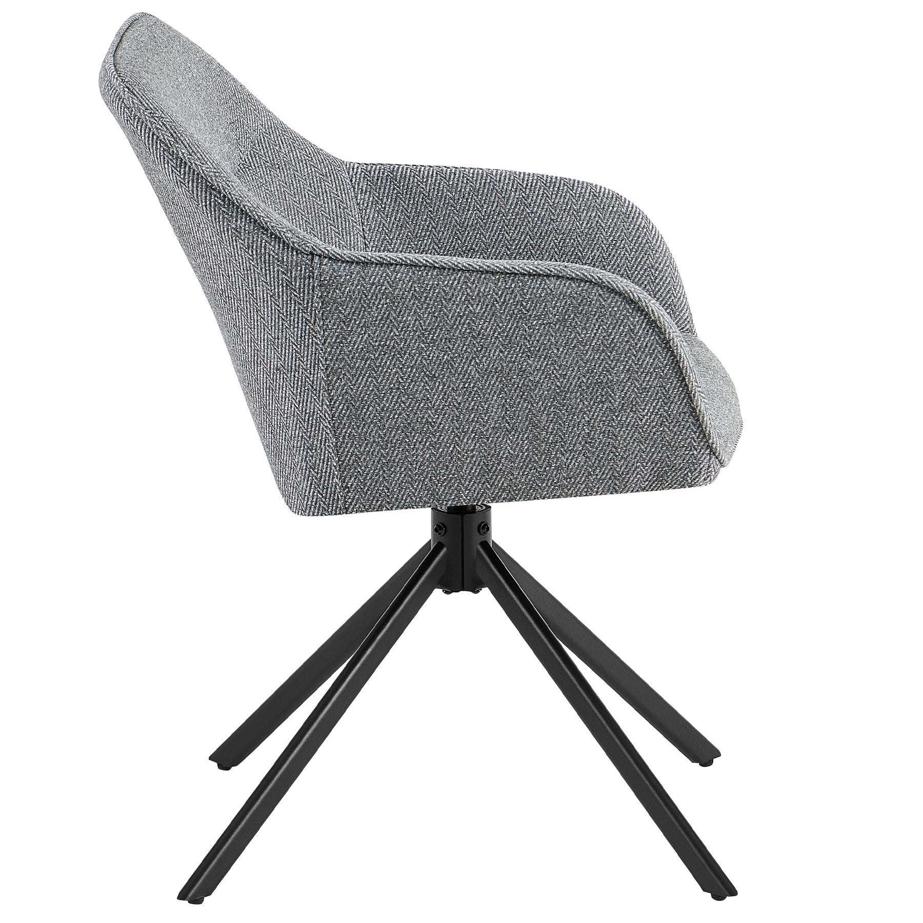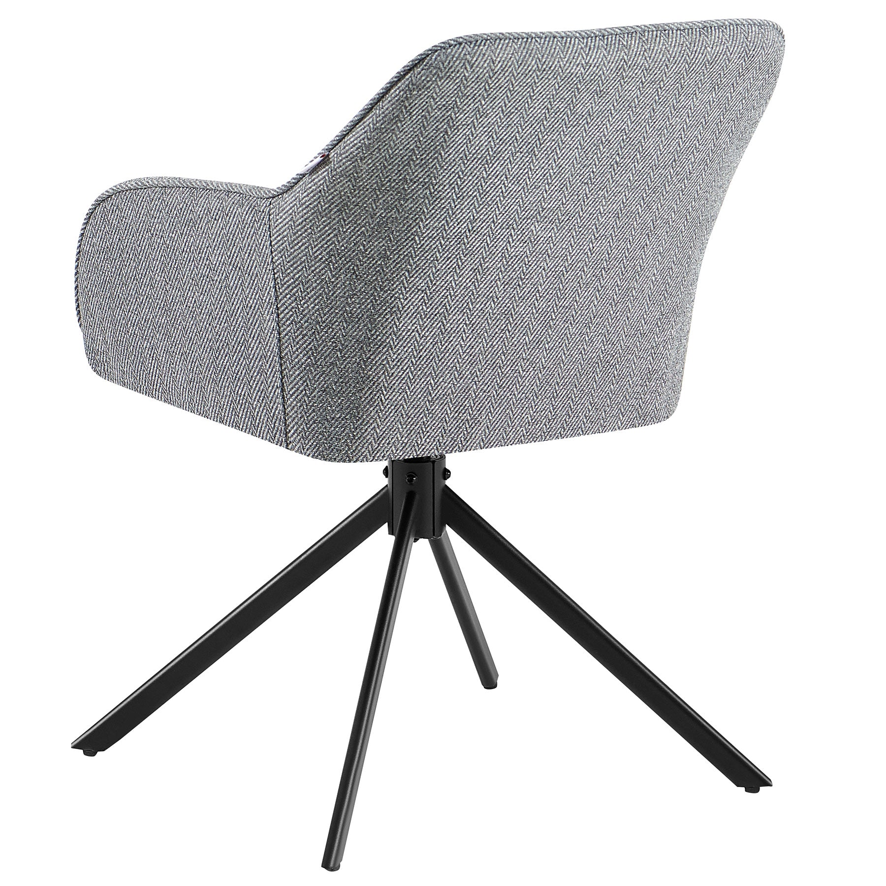 Die ergonomische Sitzschale mit Armlehnen stützt den Rücken, die komfortable Schaumstoffpolsterung lädt zu langen Runden ein. Der 100 % Polyester-Strukturstoff im Fischgrätmuster (Herringbone-Gewebe) besticht durch eine glatte, dichte Oberfläche ohne Rippen und eine hochwertige, fein gezeichnete Optik. Das schwarz pulverbeschichtete Metallgestell in stabiler Stativform sorgt für Langlebigkeit und sicheren Stand; Bodenschoner schützen empfindliche Böden. Mit rund 6,8 kg lässt sich der Esszimmerstuhl mit Armlehnen leicht bewegen und flexibel kombinieren.