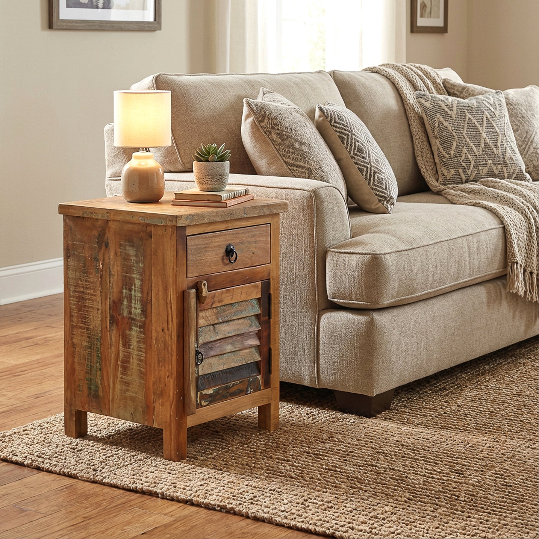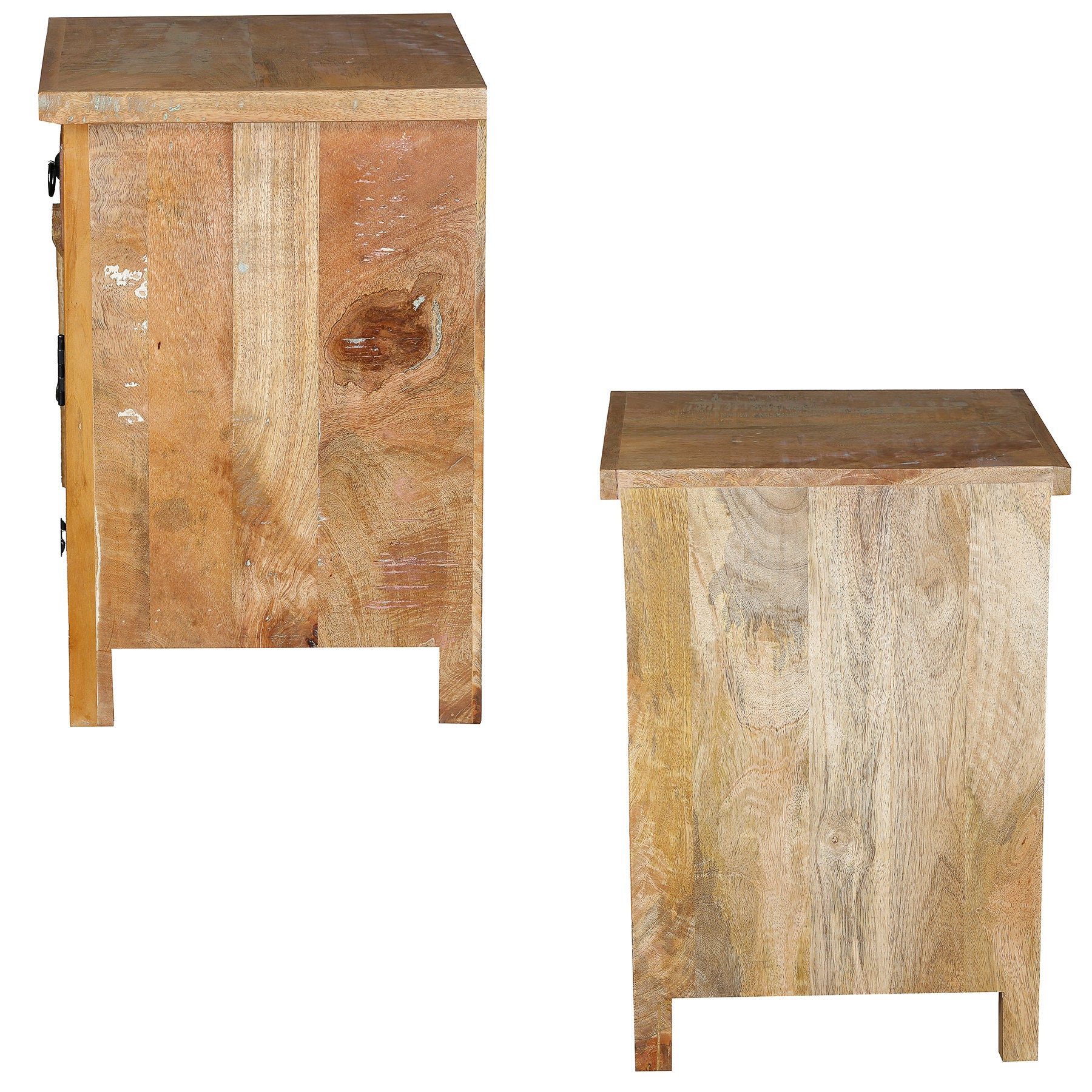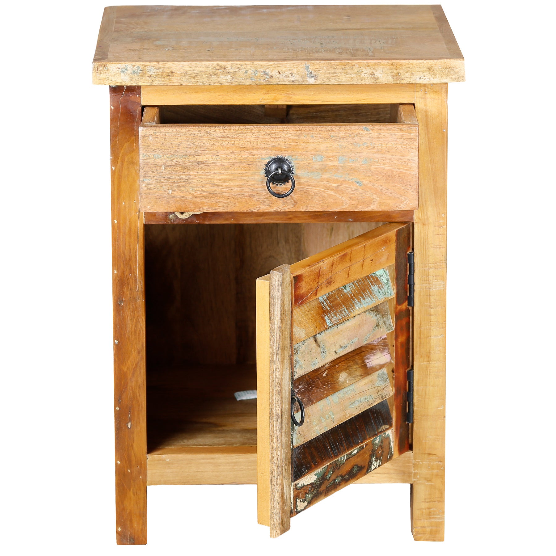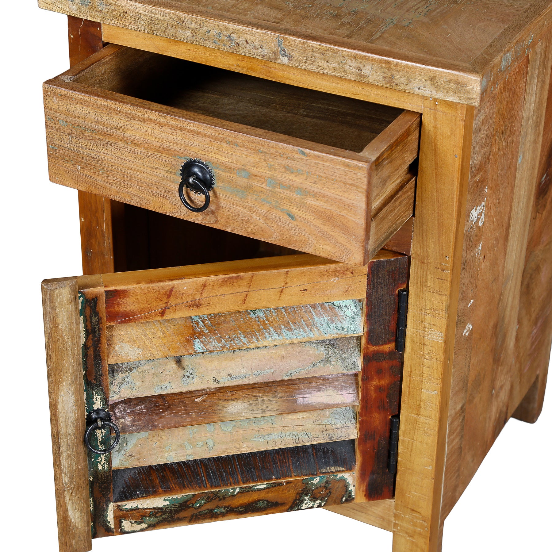 Kommode aus massivholz mit Schublade und Tür, mit Patchwork-Front aus Holzplanken und Metallringgriffen