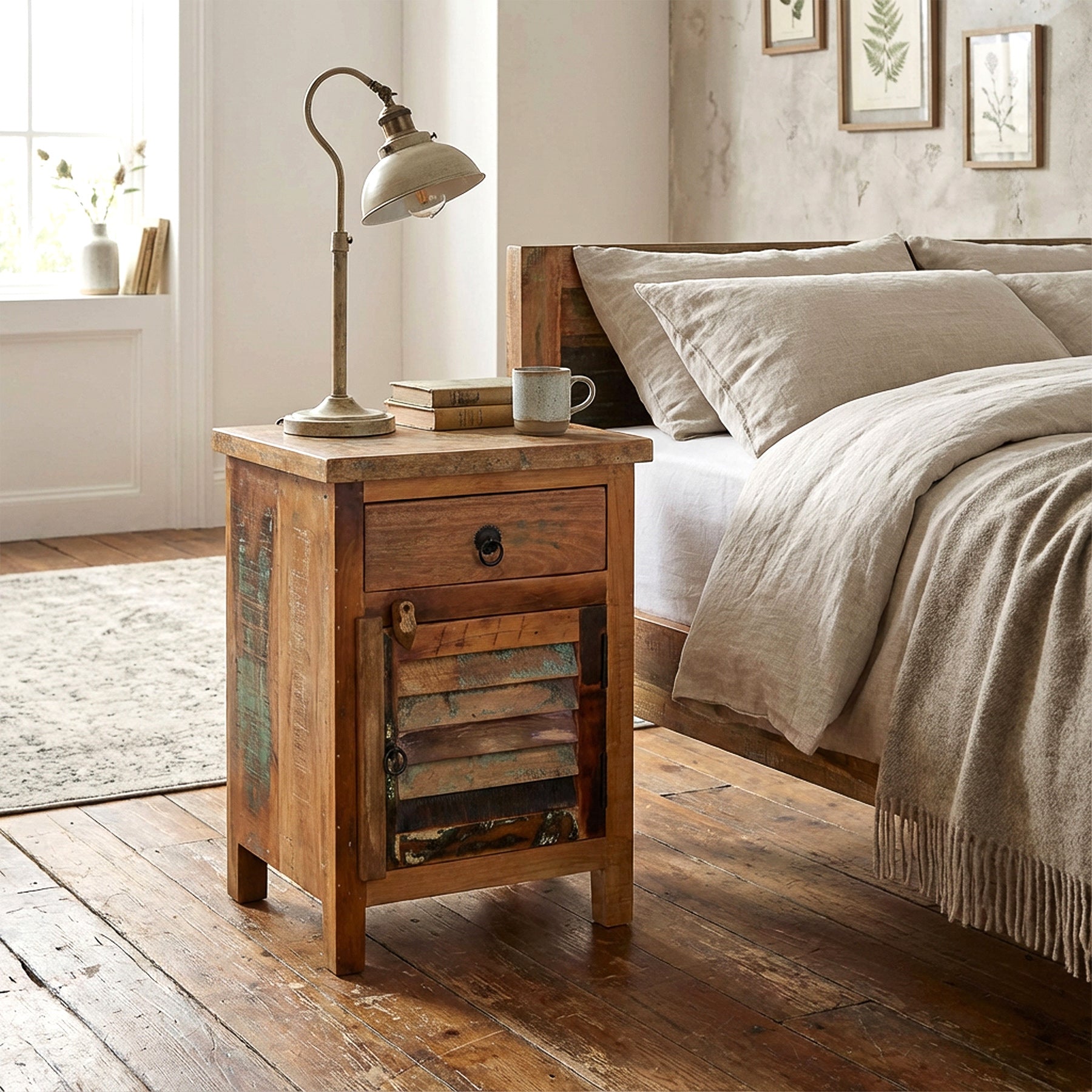 Kommode aus Massivholz als Nachttisch im Schlafzimmer, ruhige Boho-Atmosphäre, warmes Licht
