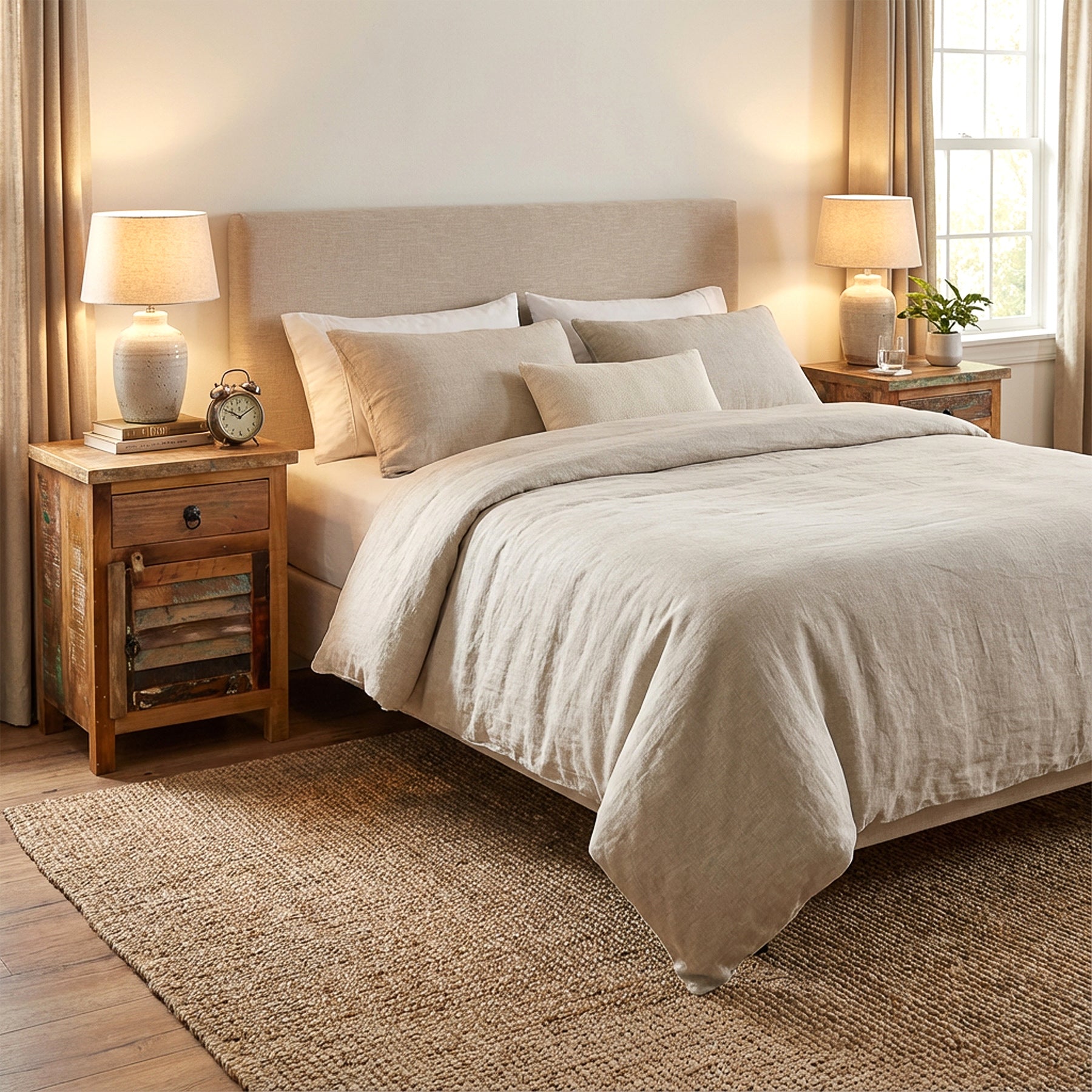 Kommoden aus massivholz als Nachttische im Schlafzimmer, helle Textilien, warmes Licht