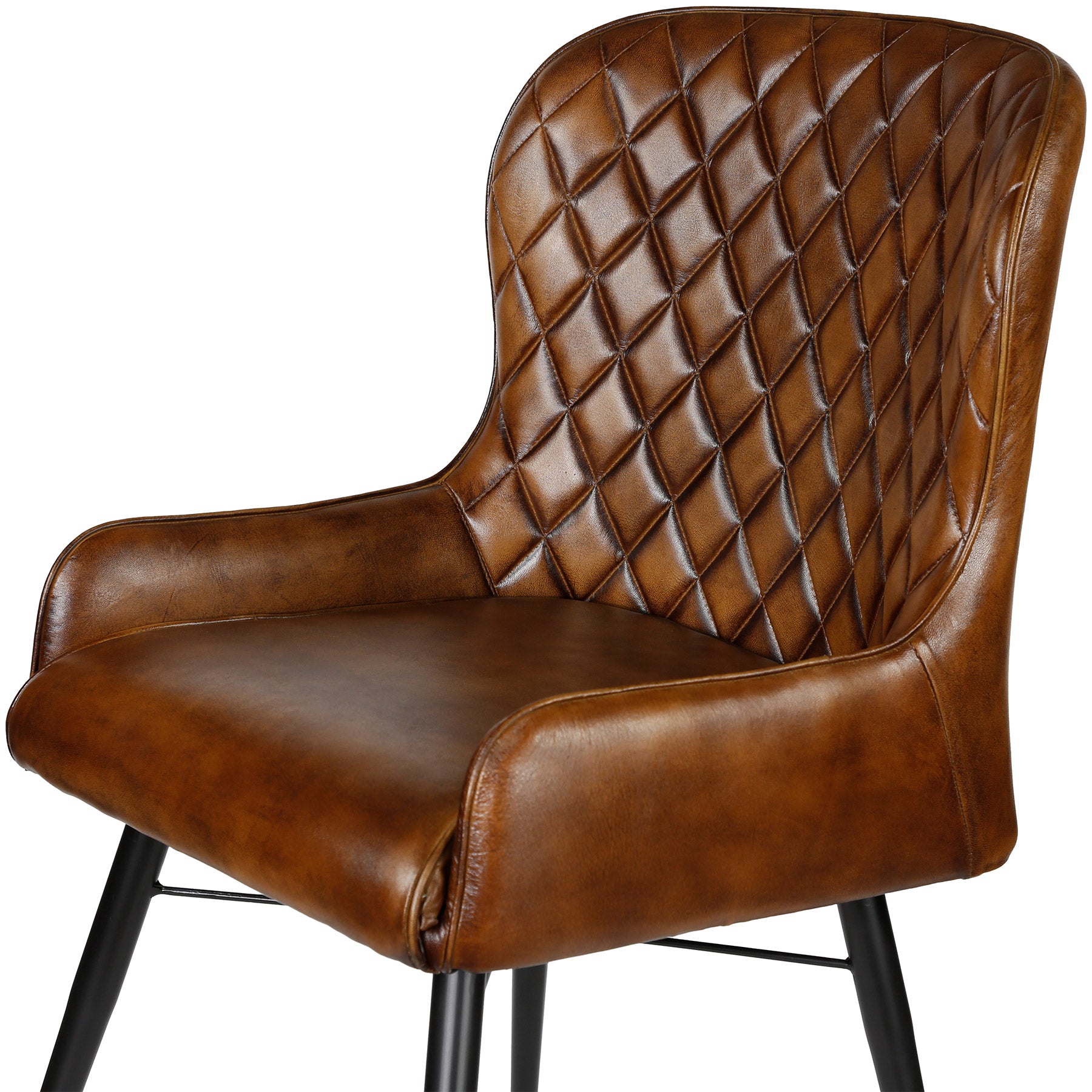 Feines Echtleder in Antikbraun, sanft geschwungene Linien und eine edle Rautensteppung: Dieser Stuhl bringt handwerkliche Qualität und ruhige Eleganz in Dein Zuhause.