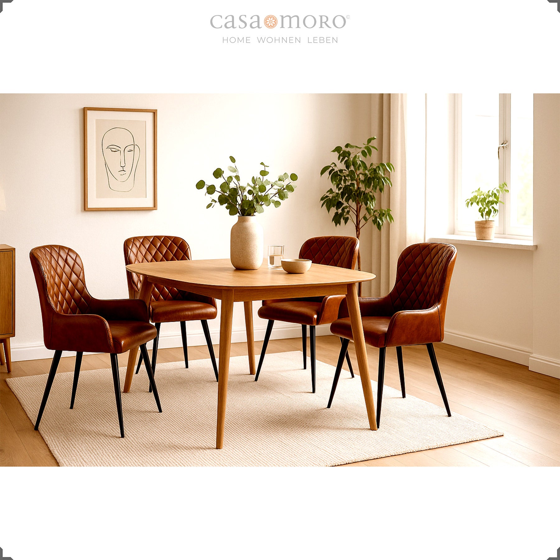 Vier antikbraune Lederstühle mit Rautensteppung um einen runden Holztisch in einem hellen, freundlich eingerichteten Wohnzimmer mit Pflanzen und Tageslicht.