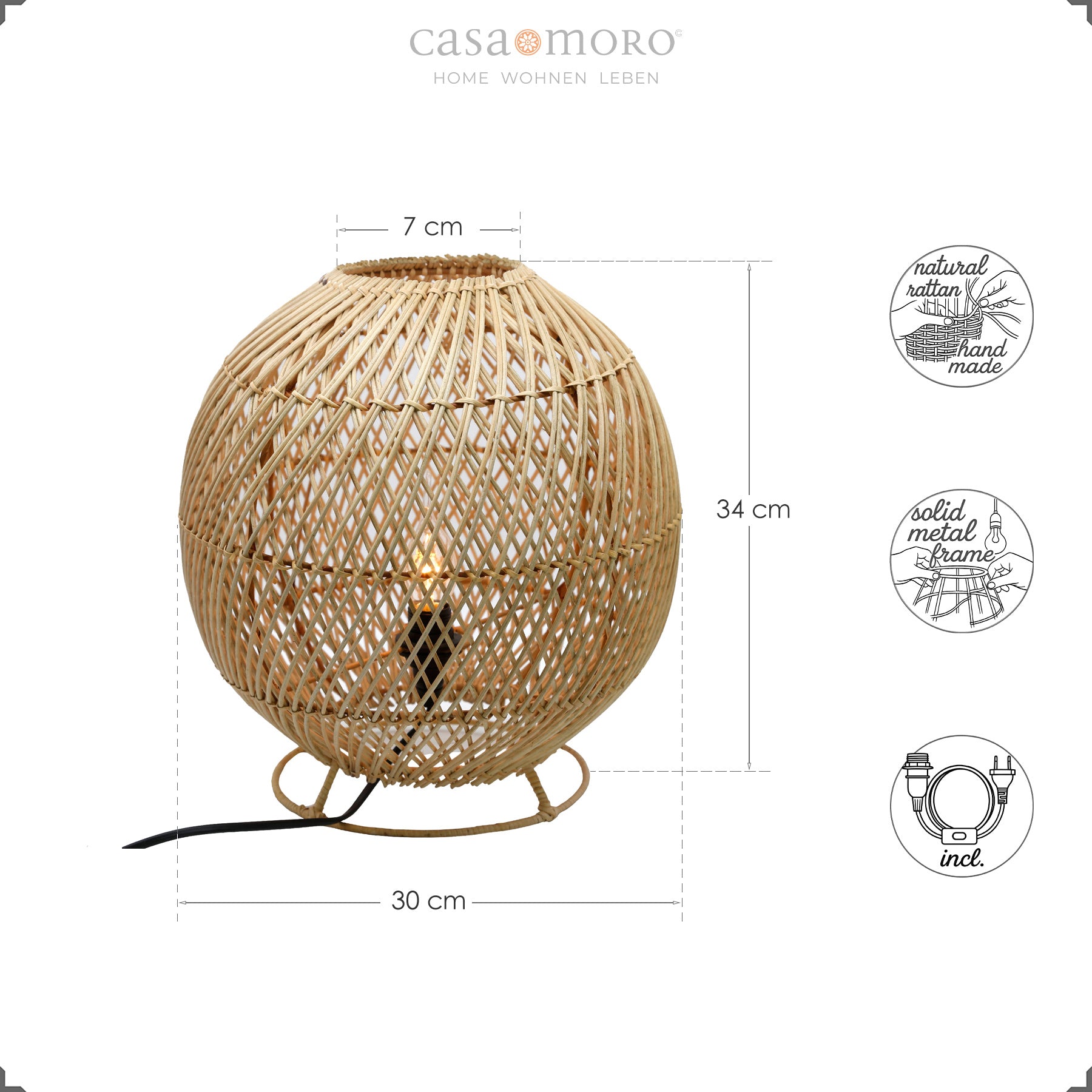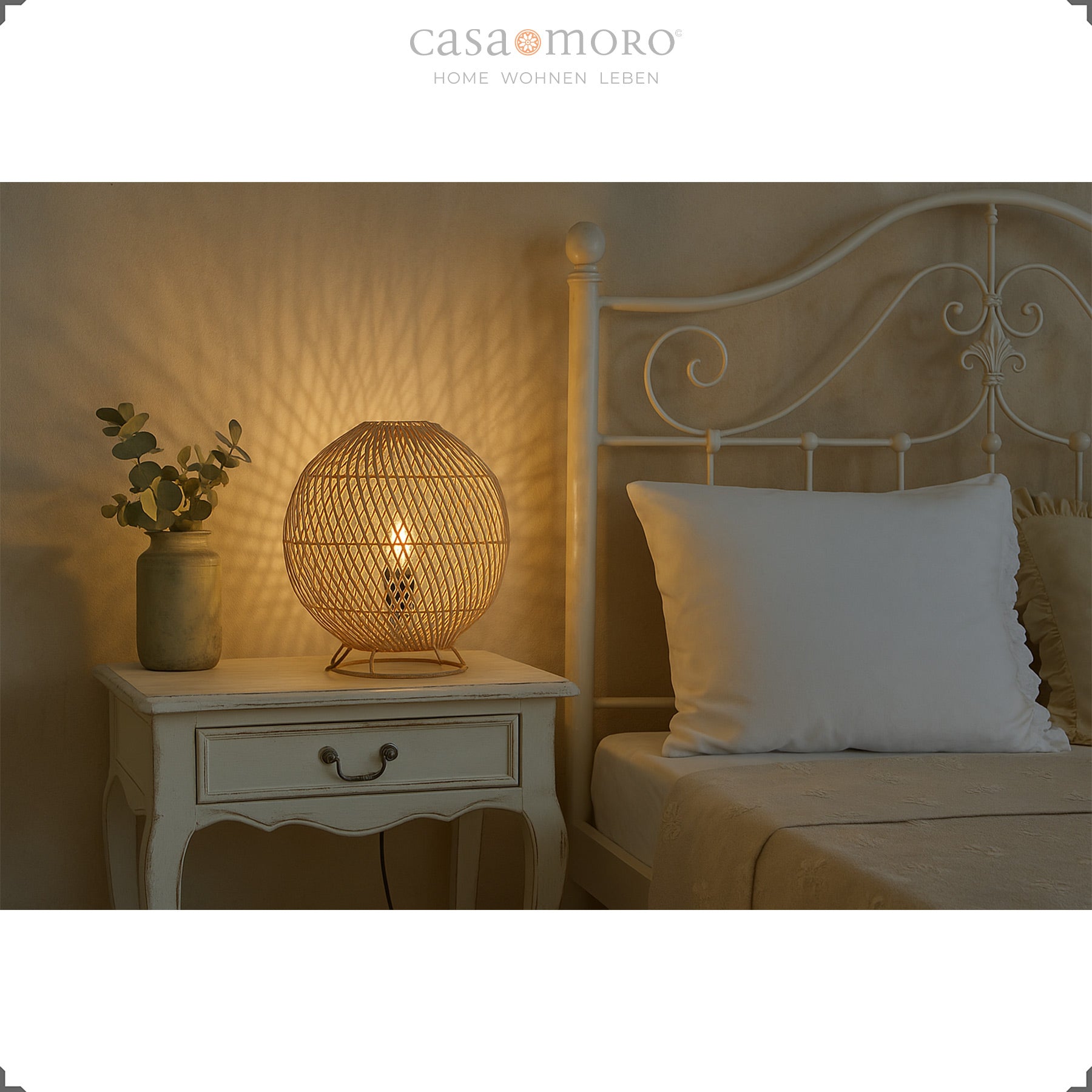 Diese Tischlampe aus handgeflochtenem Rattan vereint feine Handwerkskunst mit sanfter Ausstrahlung. Die harmonische Kugelform streut das Licht weich durch das Geflecht und zeichnet ein lebendiges Muster auf Wand und Tisch – ideal als Nachttischlampe im Schlafzimmer oder als stimmungsvolle Tischleuchte im Wohnzimmer.