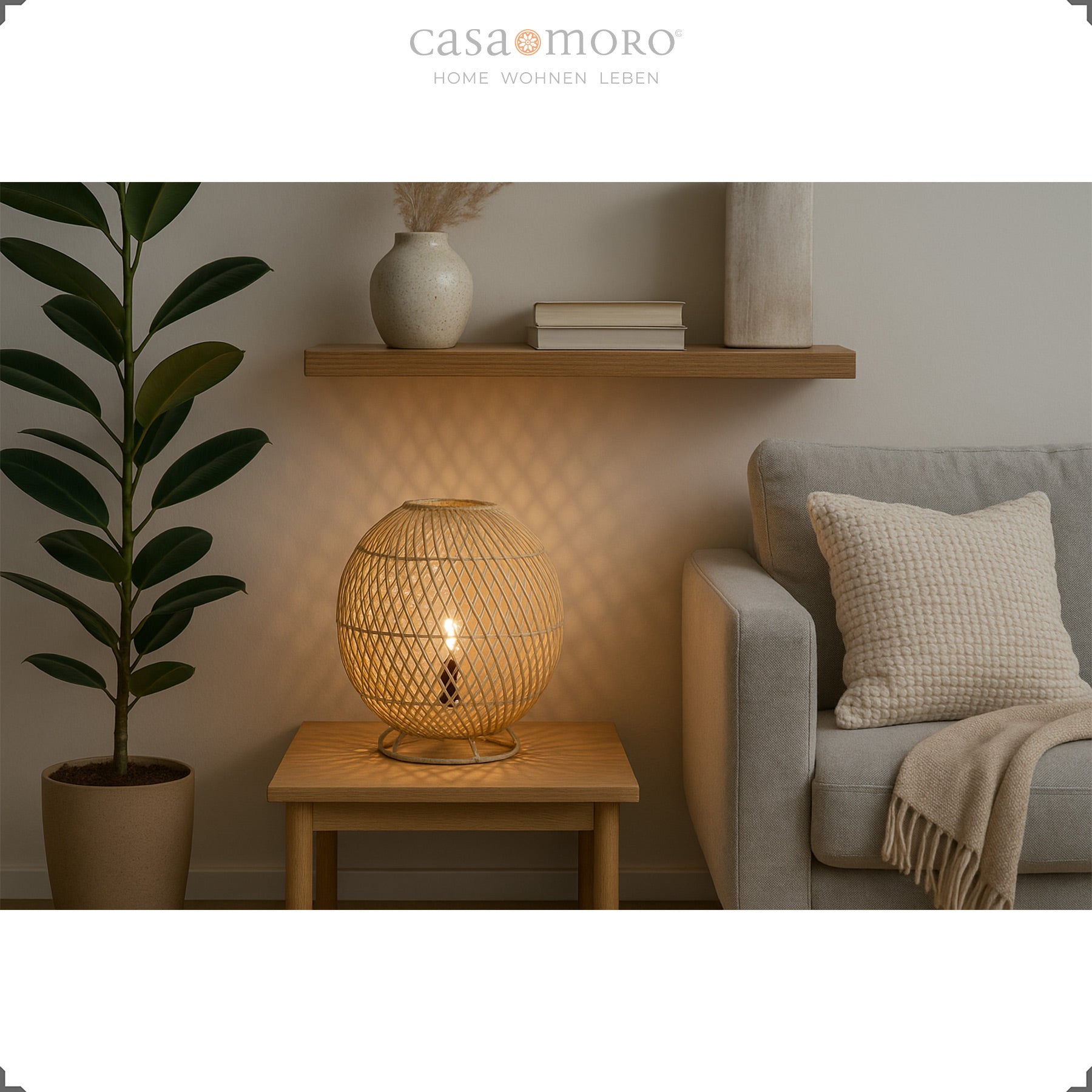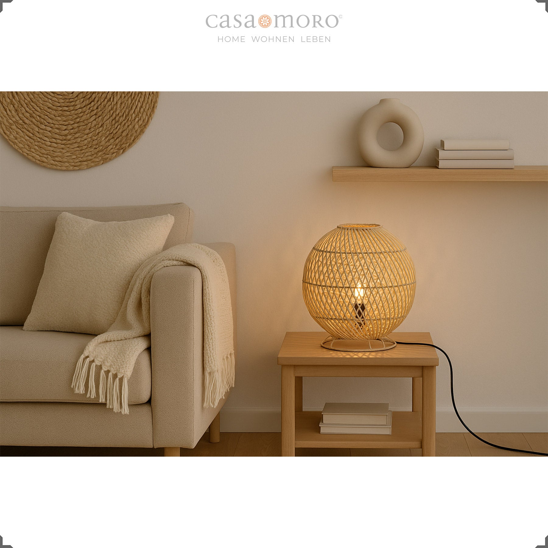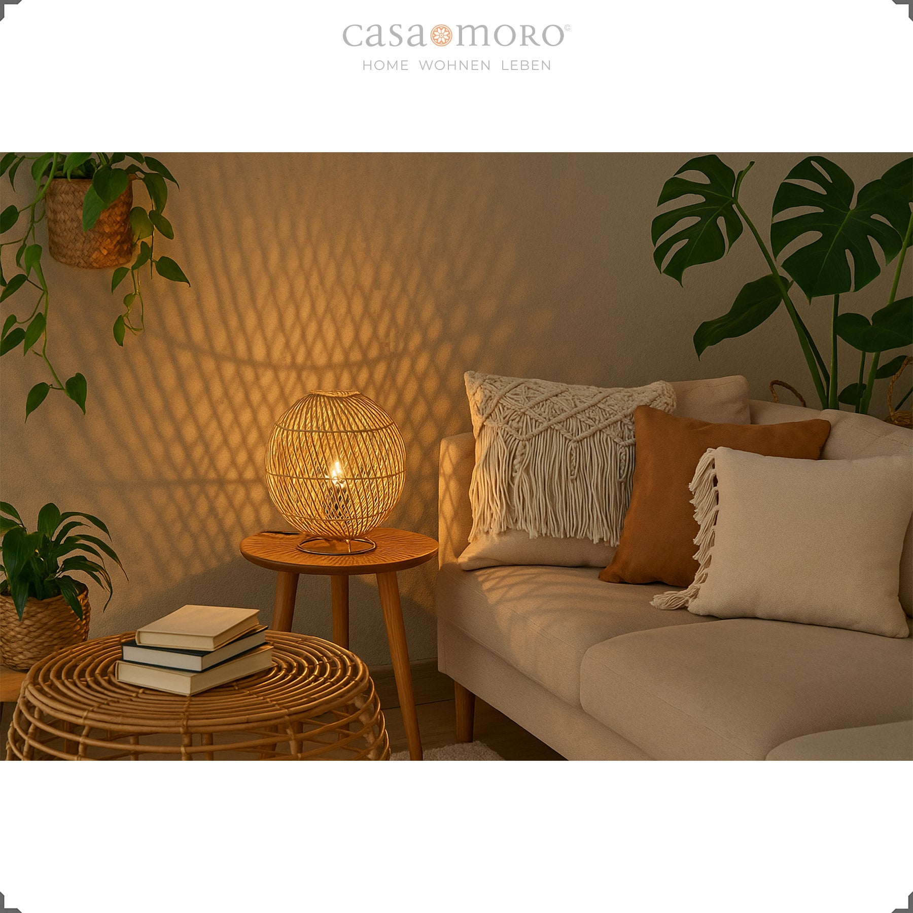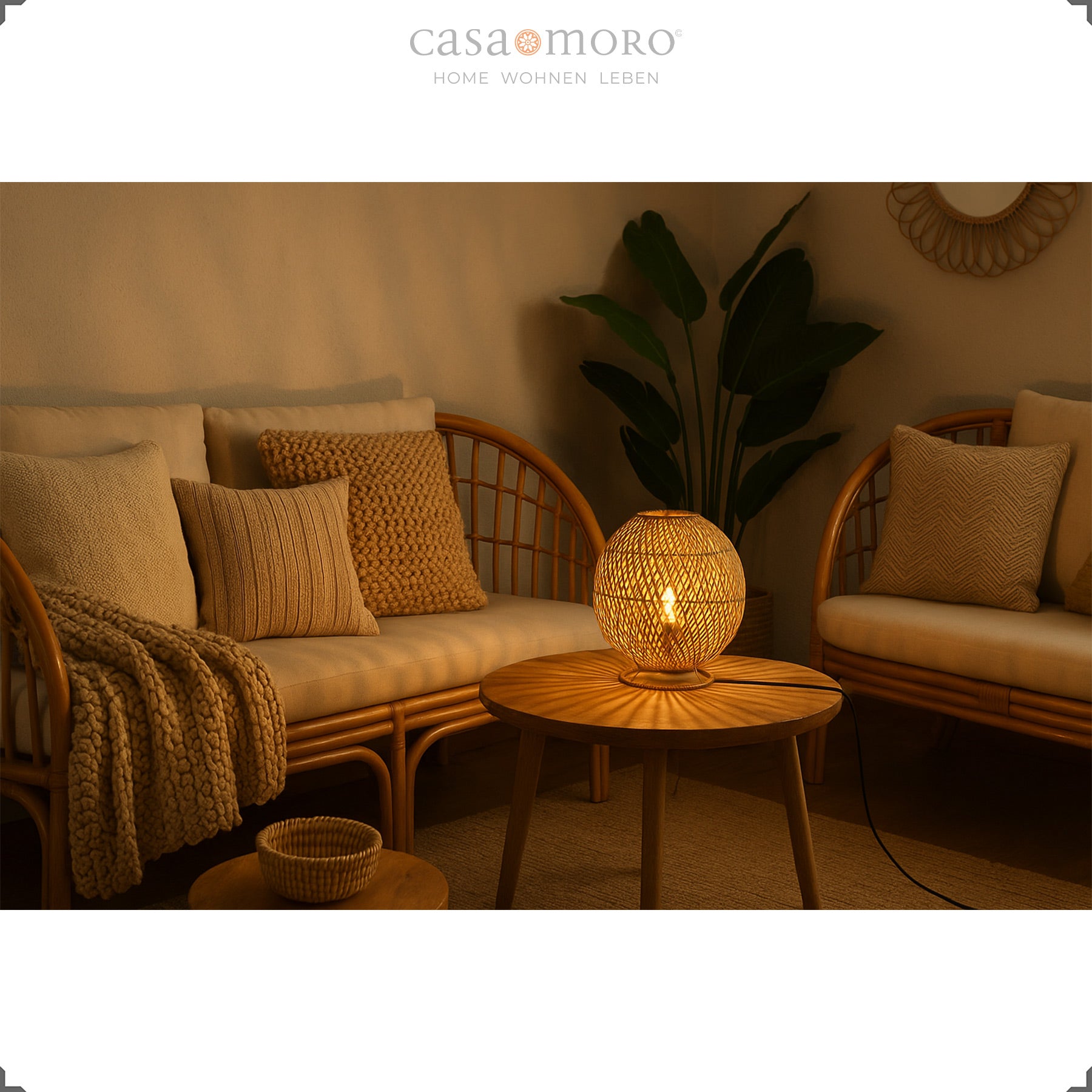 Jede Rattanlampe entsteht in sorgfältiger Handarbeit. Kleine Unterschiede in Farbe, Geflecht und Form sind gewollt und machen jede Boho Tischlampe aus Rattan zu einem besonderen Unikat – natürlich, warm und wohnlich.