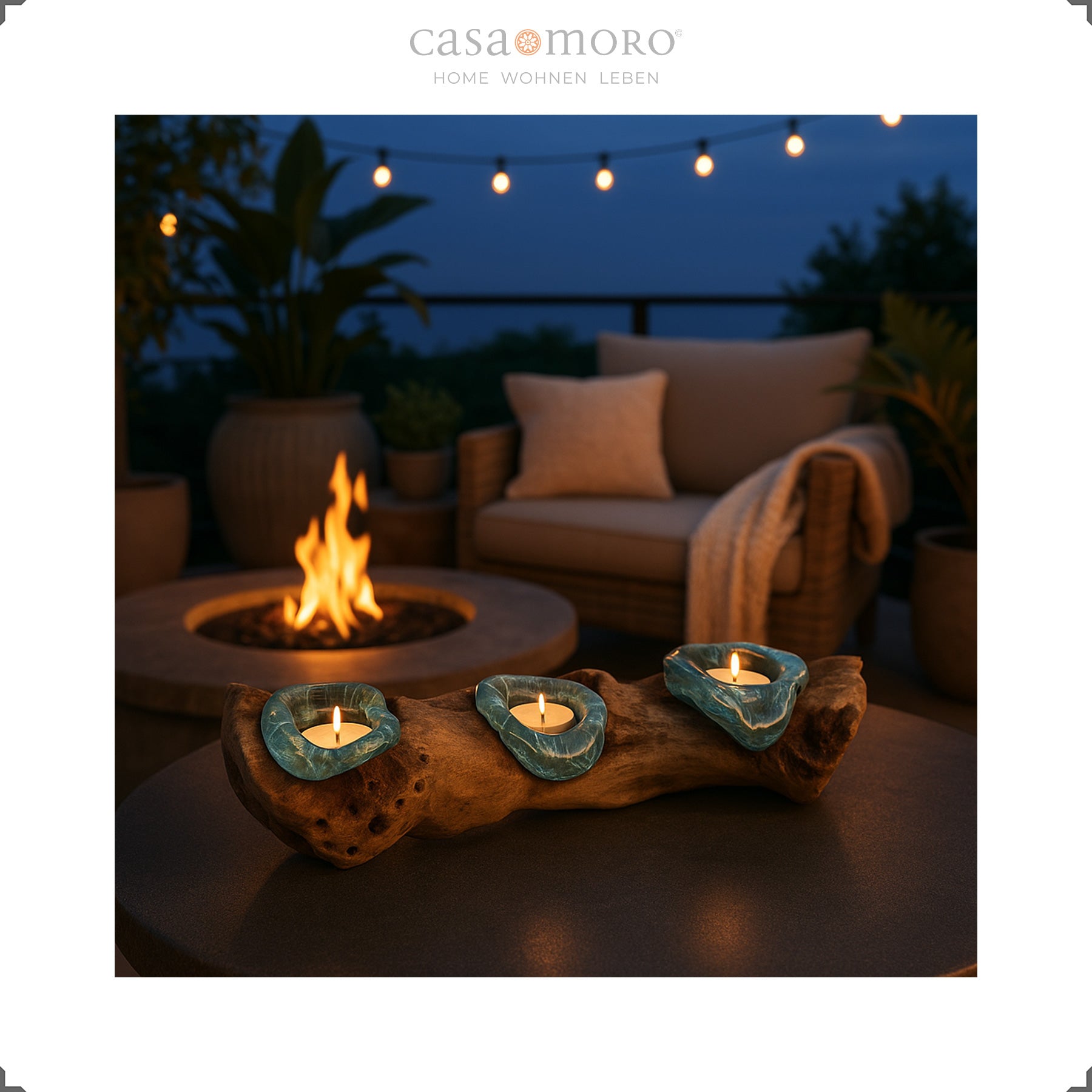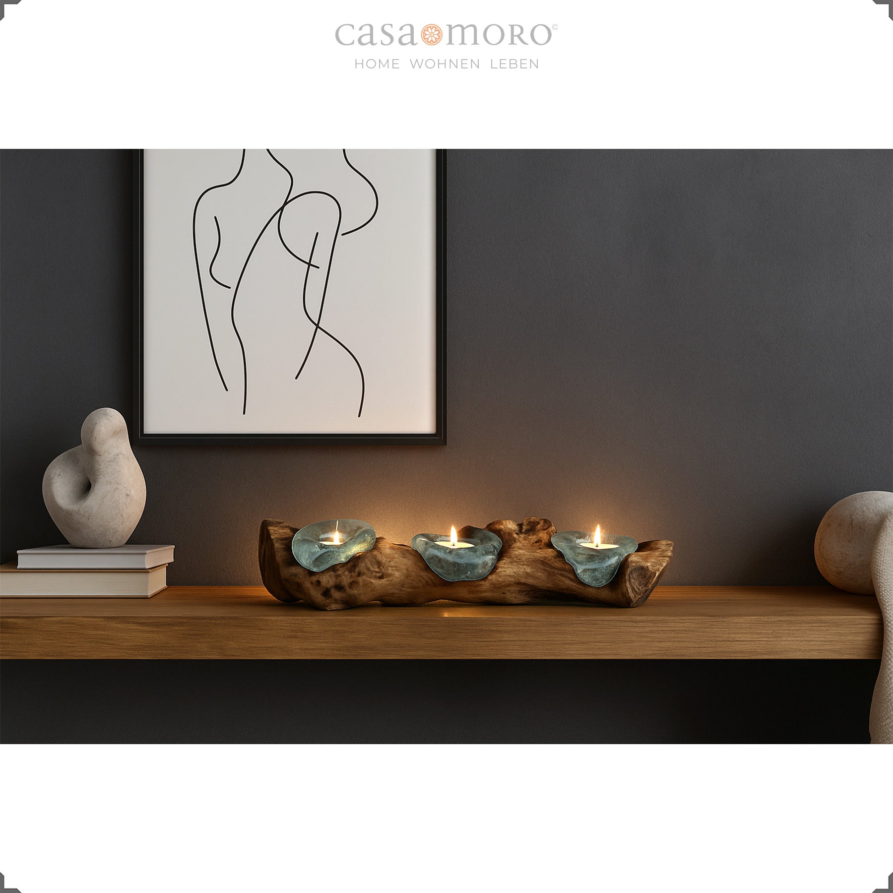 Met ruimte voor drie theelichtjes is de houder ideaal om de eettafel, het dressoir of de vensterbank in een zacht licht te hullen. De combinatie van glas, hout en de levendige vormen van de teakhouten stam creëert een decoratieve lijn van licht die zowel in het dagelijks leven als bij speciale gelegenheden effect heeft.