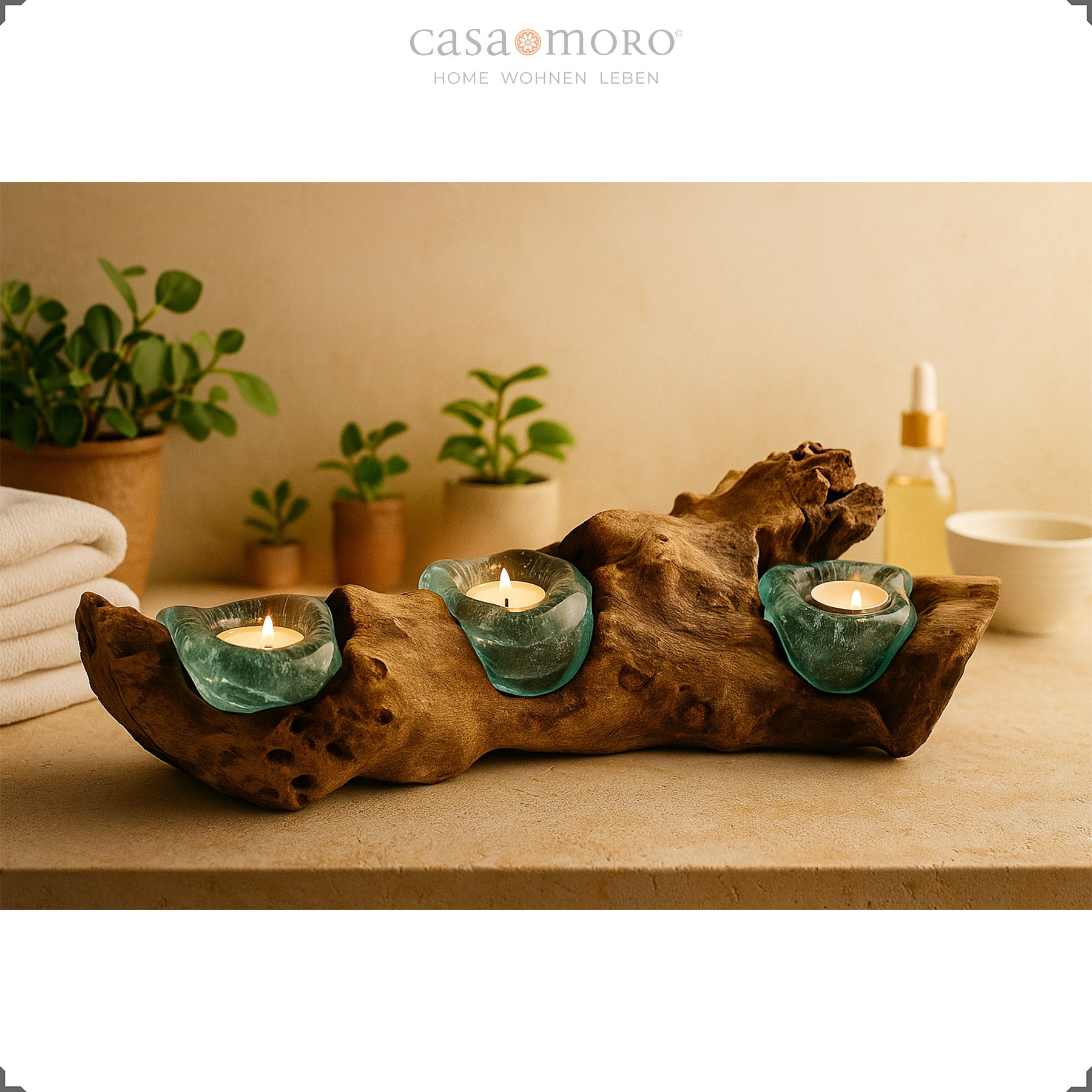Deze langwerpige theelichthouder verandert wortelhout en glas in een sfeervolle tafeldecoratie met drie zachte lichtpunten. Het natuurlijk gegroeide teakhout draagt de mondgeblazen glazen vormen als kleine lichtschalen en brengt warm kaarslicht in harmonie met de ruwe schoonheid van het hout.