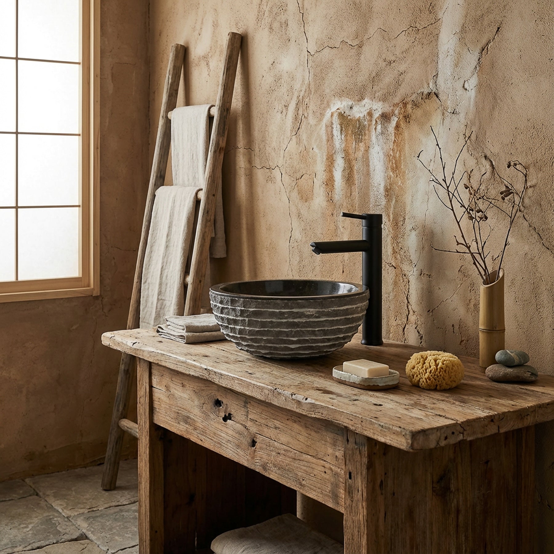 Dit Wastafel gemaakt van steen combineert moderne elegantie met authentiek vakmanschap. Het gepolijste, donkergrijze binnenoppervlak ontmoet een met de hand uitgehouwen, gegroefde structuur aan de buitenkant wasbakken een bijzondere diepgang en een onmiskenbaar, natuurlijk charisma. Ideaal voor moderne badkamers, gastentoiletten of houten wastafels.
