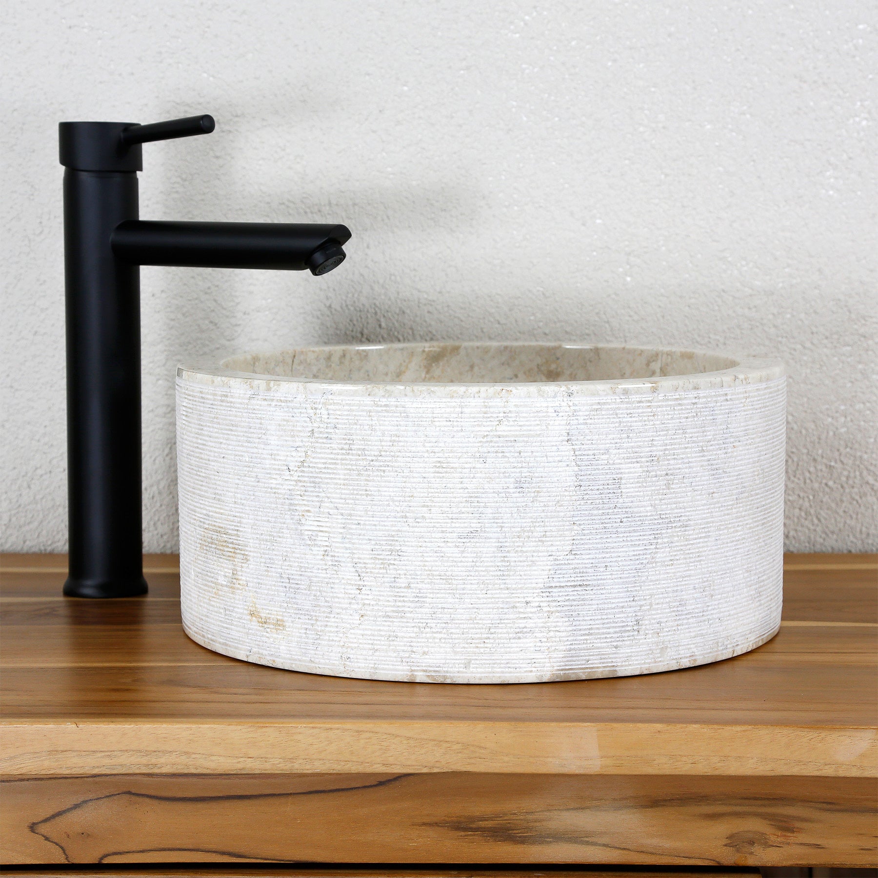 Ronde opzetwastafel van licht natuursteen met een fijne lijnstructuur, gecombineerd met een zwarte stand-alone kraan.